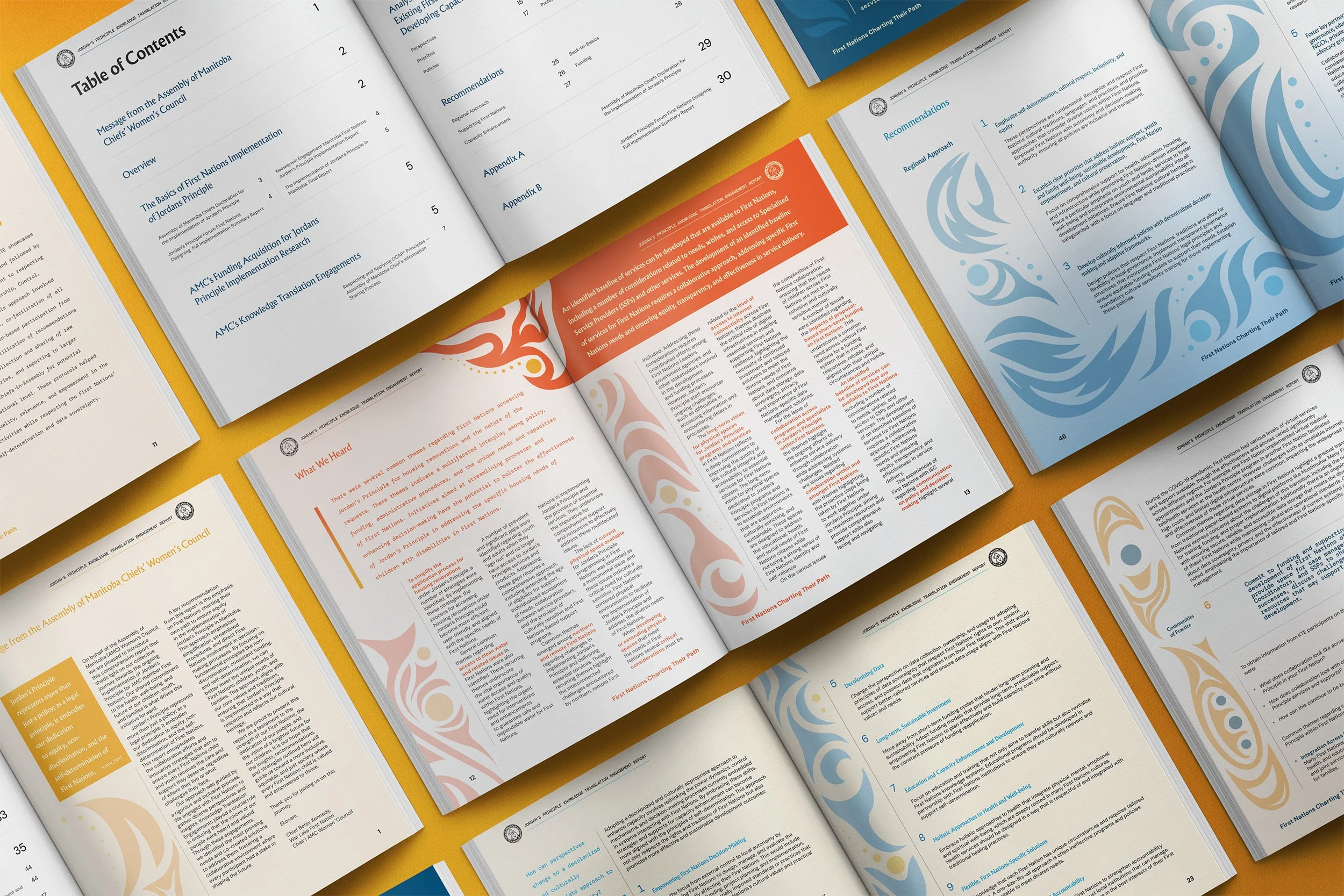 I designed this engagement report for the Assembly of Manitoba Chiefs to document First Nations perspectives on Jordan’s Principle through an accessible and visually rich editorial format. The project involved extensive illustration, custom visual storytelling, and the vectorization of a youth designed logo commissioned through a community competition, ensuring the final publication honoured original intent and authorship while meeting production standards for print and digital use.